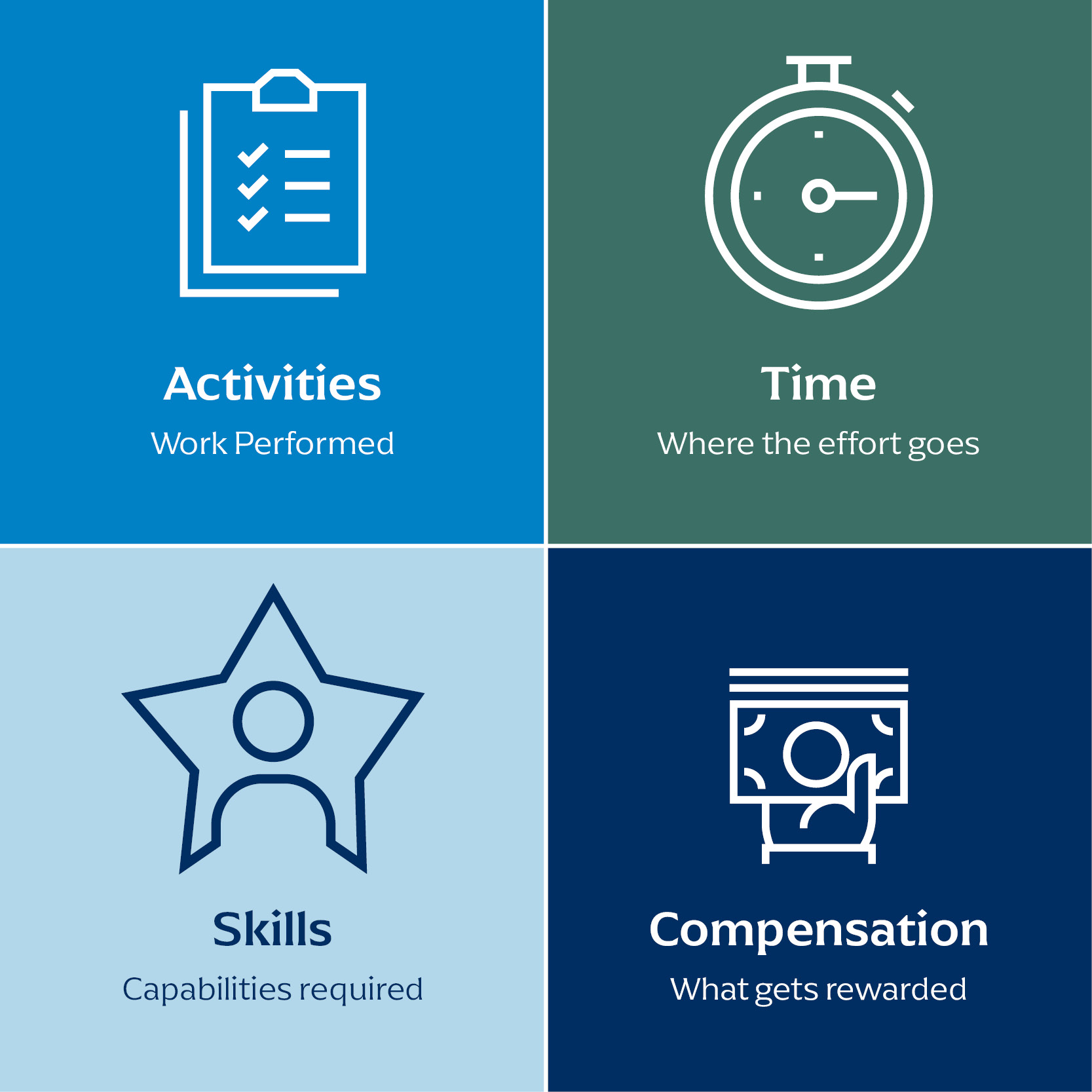To move from experimentation to advantage, leaders need a more disciplined way to think about how AI reshapes customer-facing work. The most effective lens focuses on four interdependent dimensions of job design: activities, time, skills and compensation.