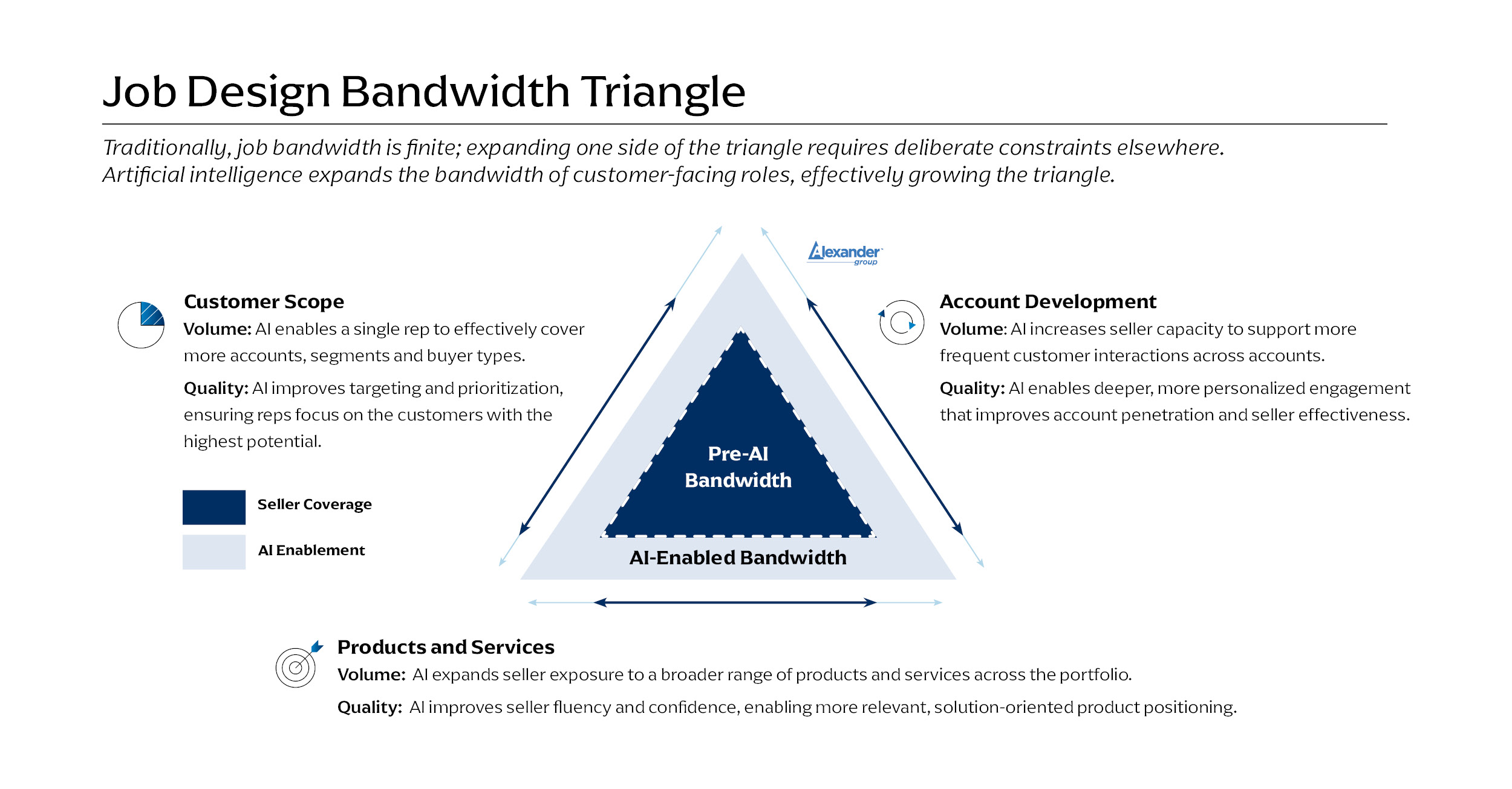 Rather than an execution issue, the gap between AI investment and business impact is a design issue. A consistent pattern has emerged across Alexander Group’s years of research, benchmarking and GTM transformation work: organizations are investing in AI faster than they are redesigning the jobs expected to use it. As a result, AI is being applied to roles built for yesterday’s operating model—thus limiting the value those tools can ultimately deliver.