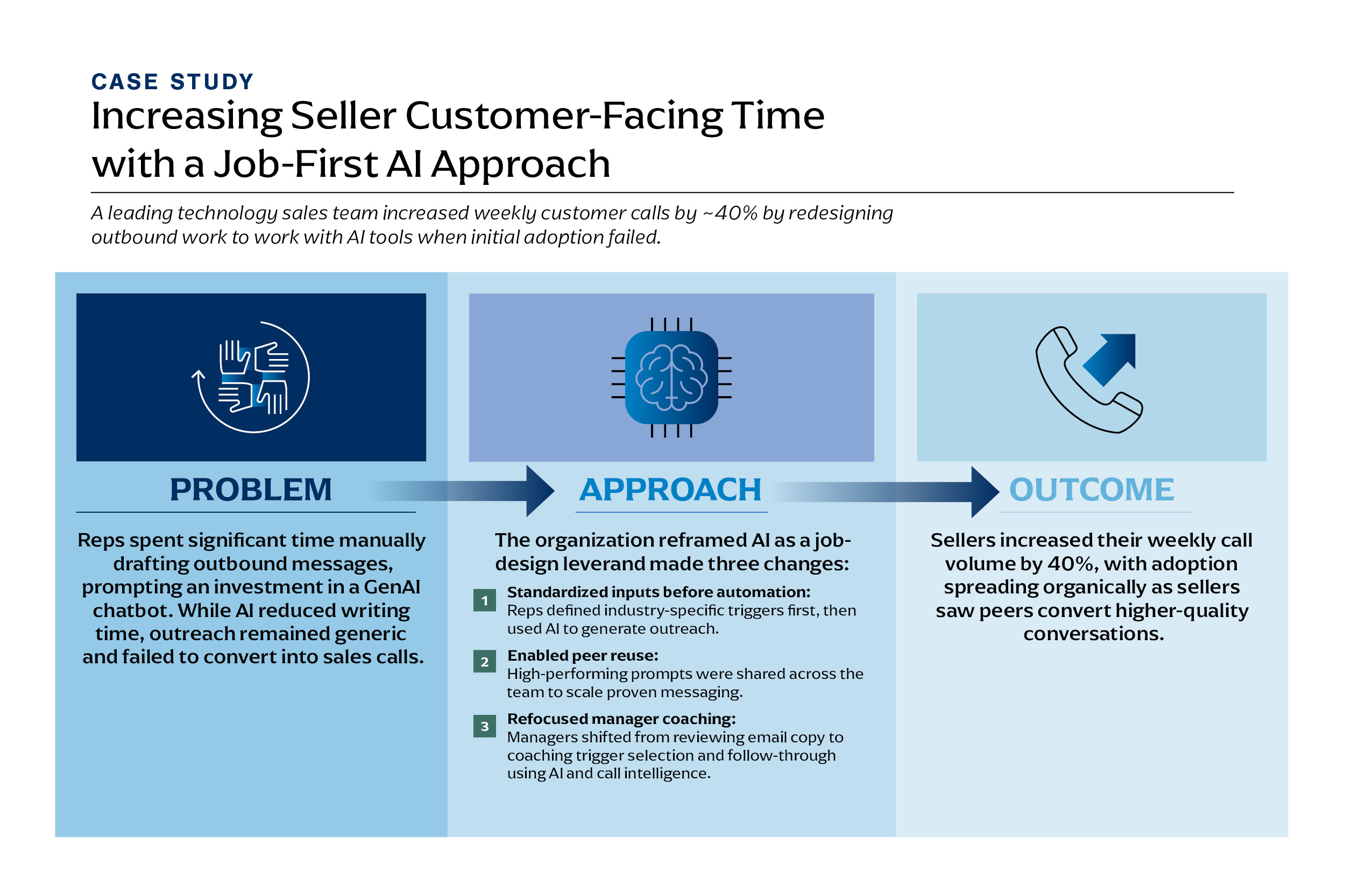 Today’s commercial leaders must understand that the most important AI decisions are not technology decisions. They are decisions about how customer-facing jobs should change, including how work is structured, how time is allocated and how performance is measured and rewarded.